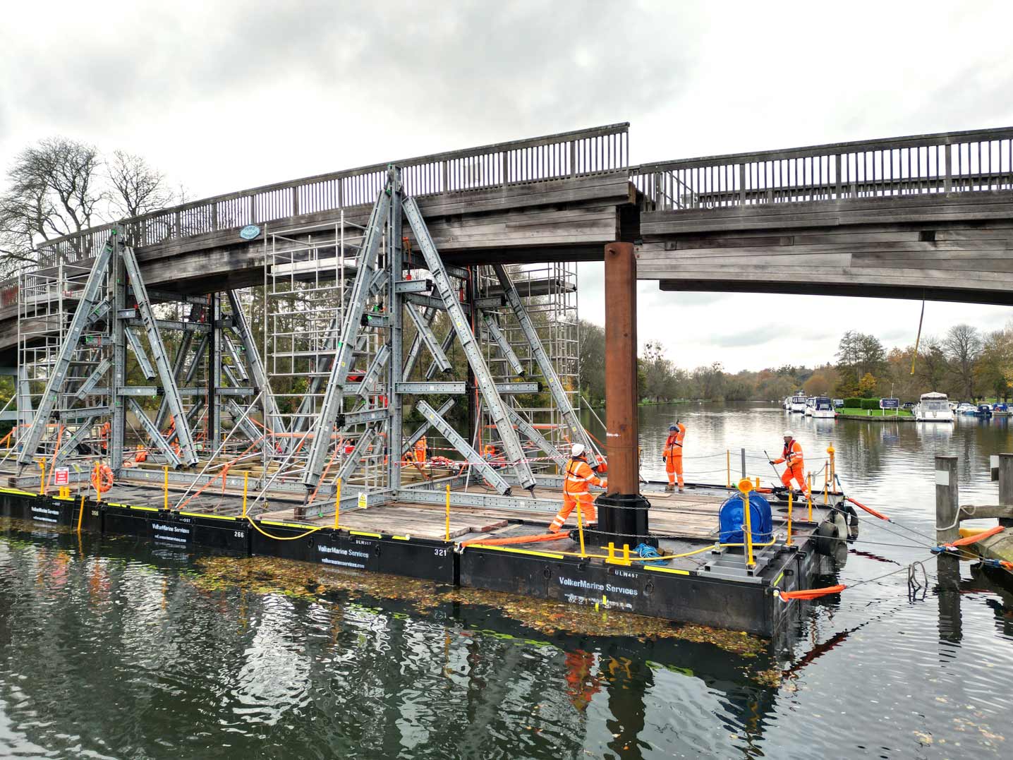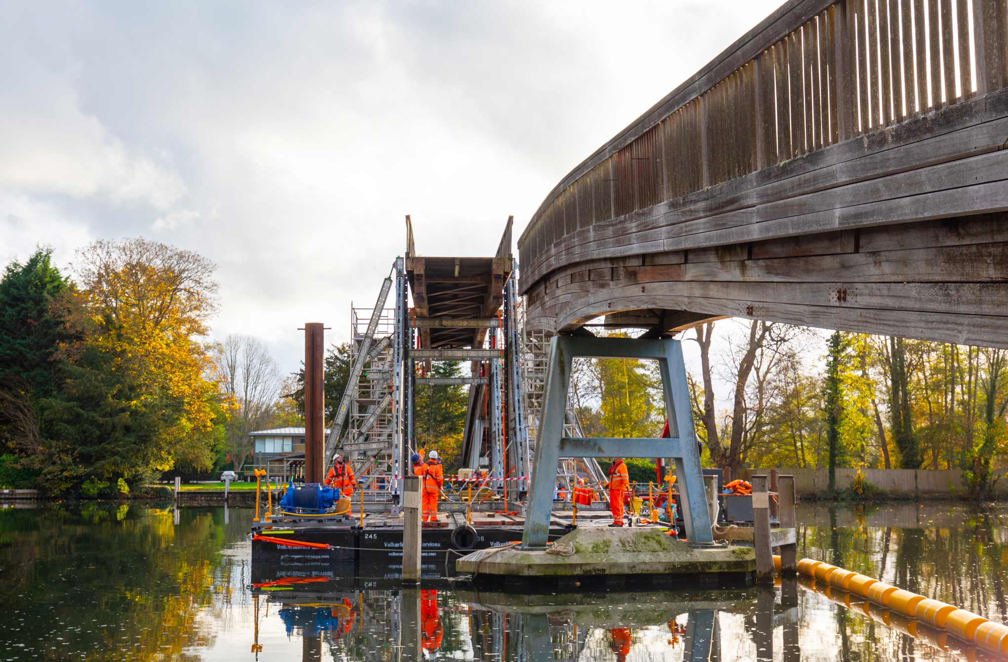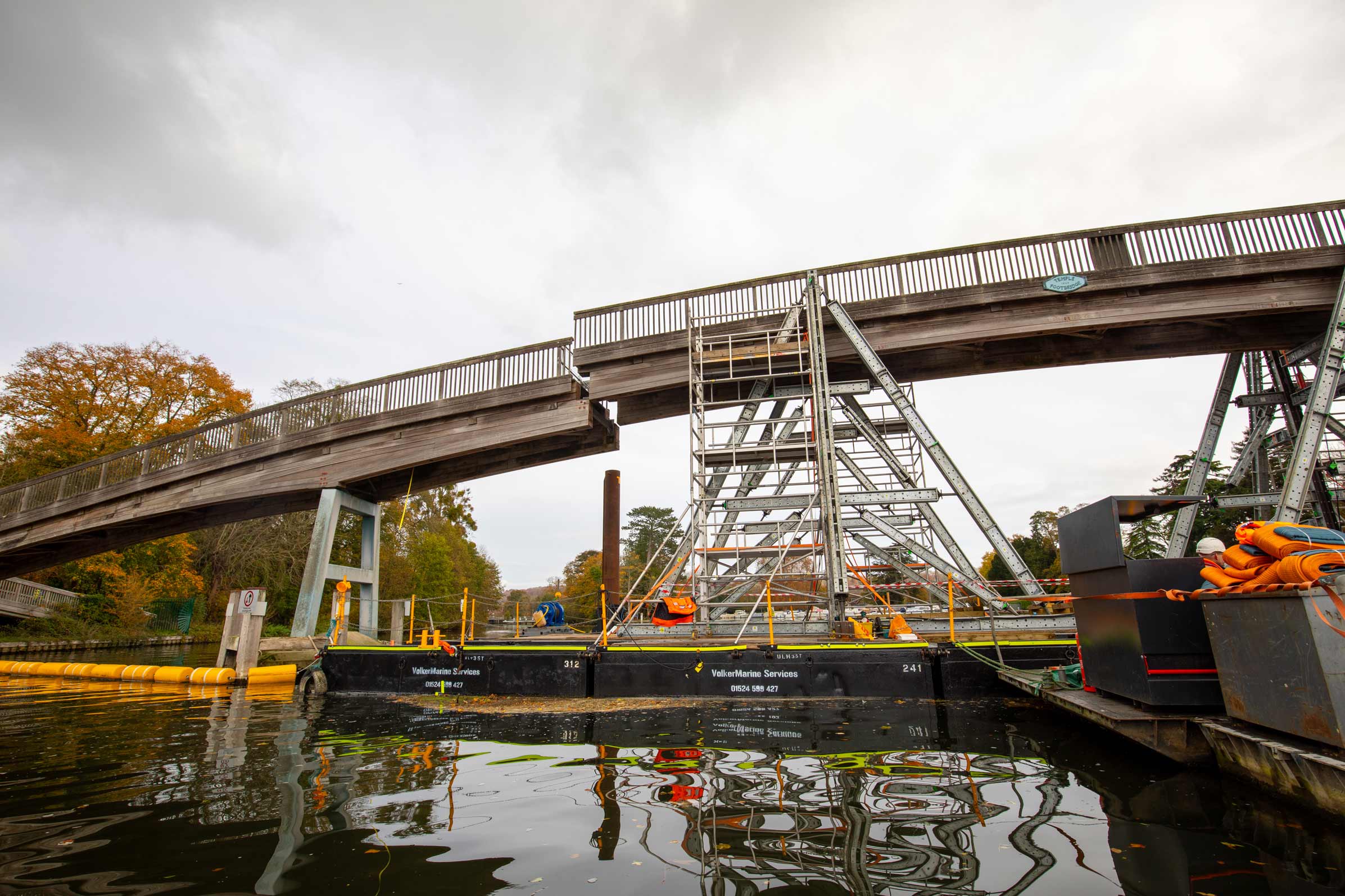 The team assembled a hydraulic bridge lifting system onto a floating pontoon, which was then positioned under the centre of the bridge span.