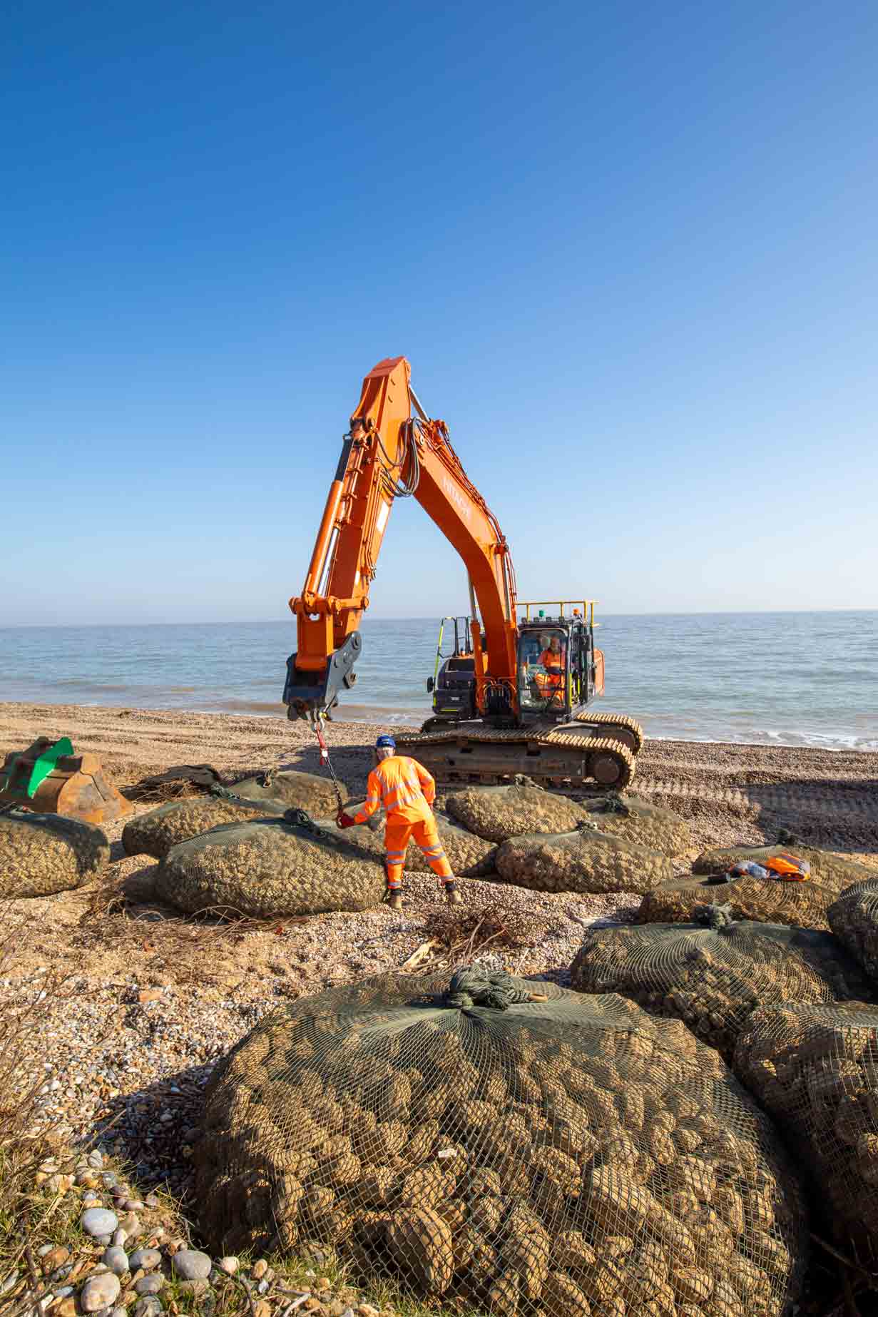 A private homeowner appointed Jackson to oversee the works in front of his house. The scheme designers are Ramboll and the rock bags have been supplied by SPS from Great Yarmouth. The bags are transported by dumper from a compound to the work site where a team from Ovenden is carrying out the rock placement work.