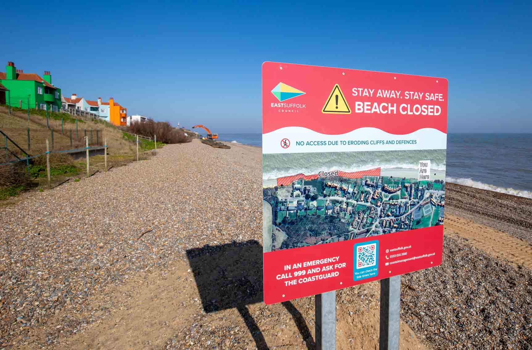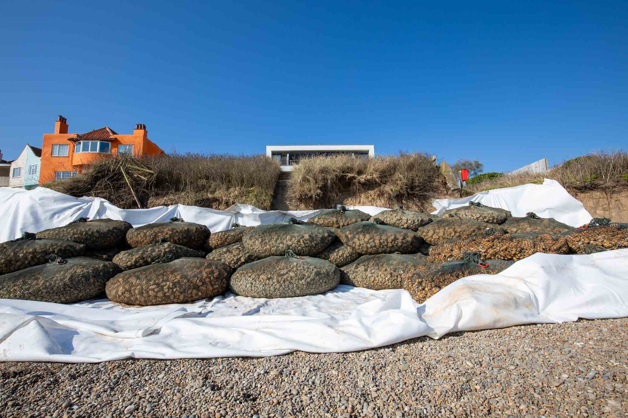 Approximately 250 rock bags are being placed along a 50-metre stretch of beach in Thorpeness near Sizewell, a village where a number of beachside properties are under threat due to coastal erosion.